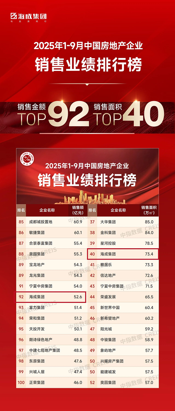 穩(wěn)行不怠 | 海成集團位列1-9月全國房企銷售面積TOP40、銷售金額TOP92